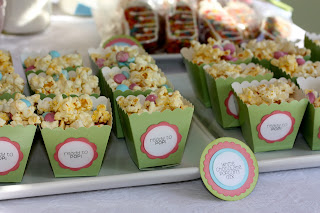 Carly made a white chocolate popcorn mix with pink and blue M&M's in it. We found these adorable green party favor boxes at Party City and I made the tags on them that said, "Ready to POP!"